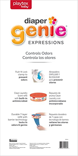 - NO MORE STINK: Diaper Genie Expressions Pail is a compact diaper trash can that prevents odor spread while disposing of your baby’s dirty diapers! The Push-N-Lock clamp helps lock-in escaping odor to keep your nursery smelling fresh.